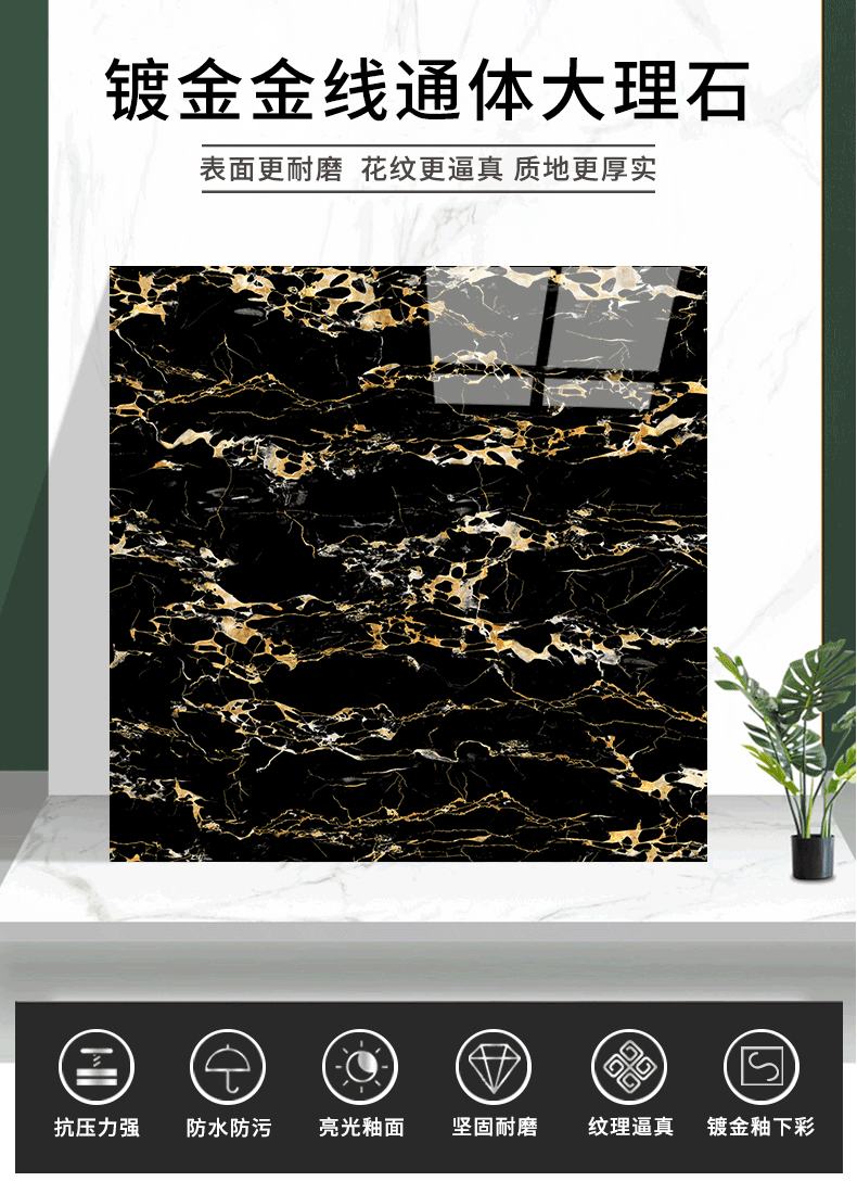 金線金粉 【產品介紹】航天級激光鍍金工藝,鉆石雕刻技術,高溫慢燒,釉層不吸污吸水率低,真空鍍金燒成后再進行真空電鍍工藝,平整如鏡面,精拋細磨,磚面平整光滑細膩光澤度、亮度、硬度較高。立體紋理,釉下彩工藝,三次淋釉增加磚面的立體感。