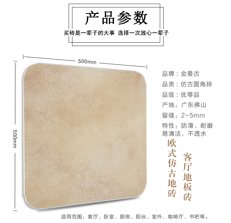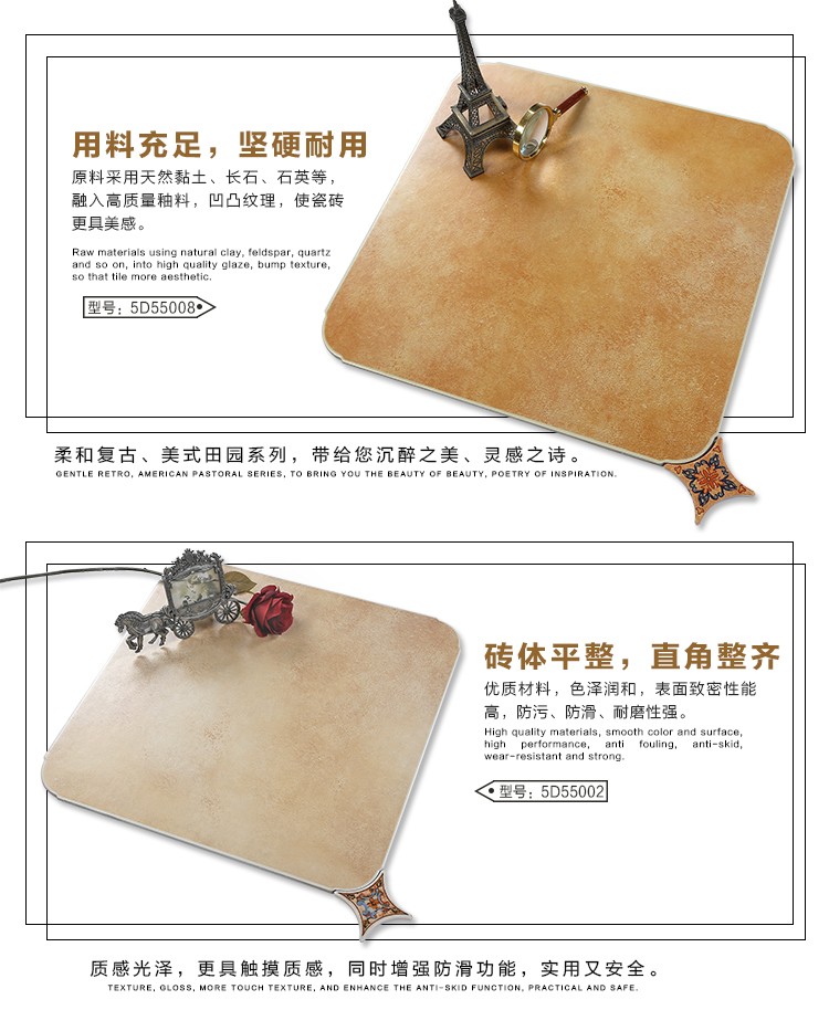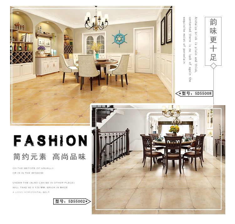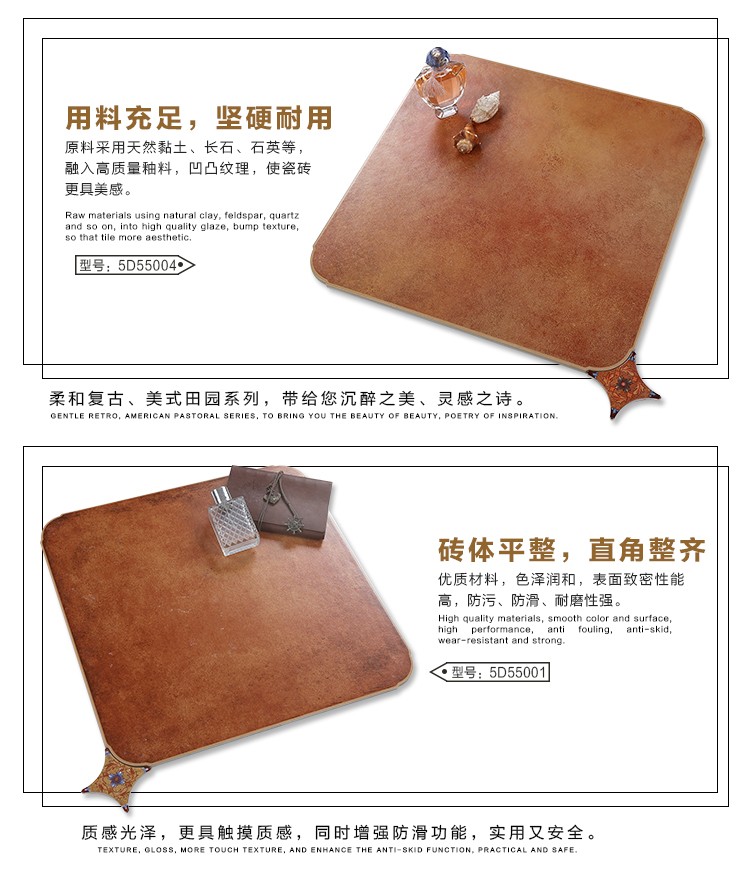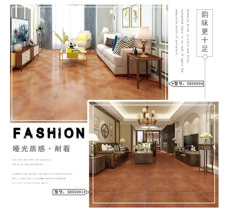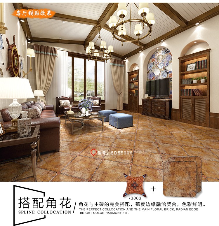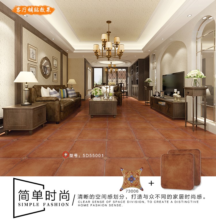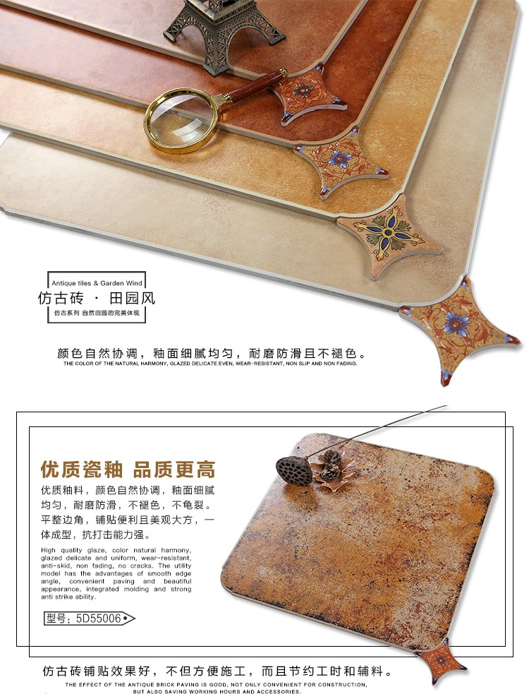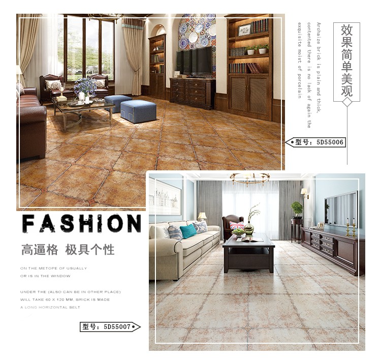 金曼古仿古地磚,采用國(guó)際先進(jìn)的超大型壓機(jī)自動(dòng)成型,經(jīng)世界一流的滾筒印花和高溫煅燒而成,通過(guò)仿石、仿巖、仿木、仿布、仿金屬等多種表現(xiàn)方式,產(chǎn)品花色圖案新穎時(shí)尚,領(lǐng)先國(guó)際潮流,具有超耐磨、防滑、防污等高性能指標(biāo)。