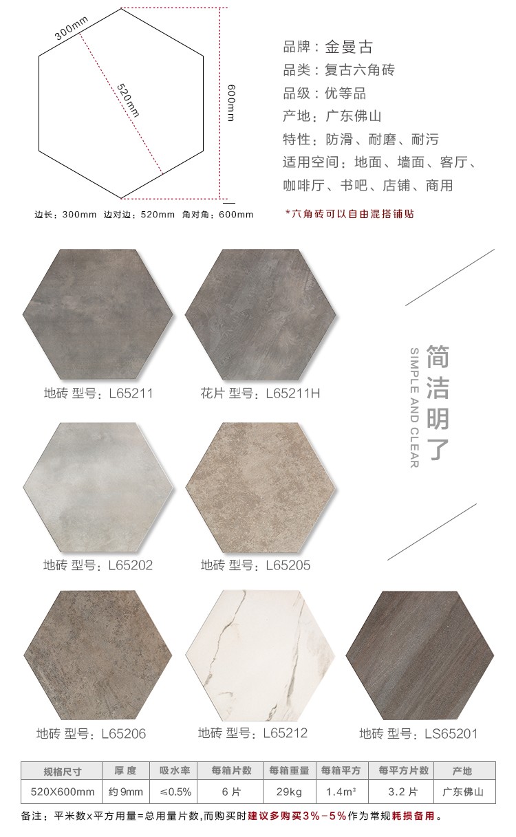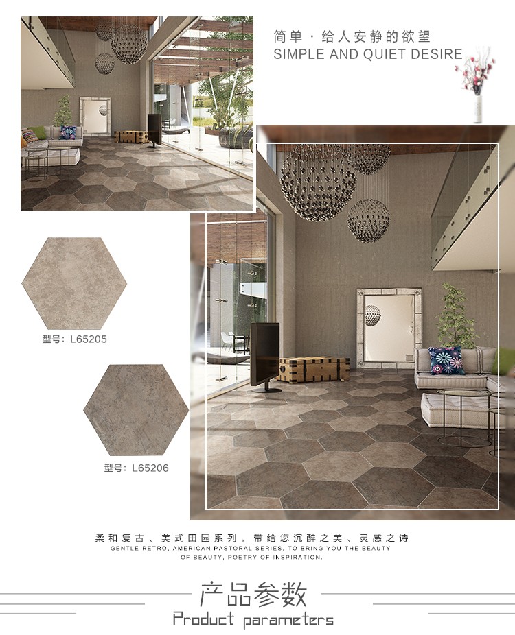 金曼古瓷磚廠家六角磚是一種表面呈現(xiàn)木紋裝飾圖案的環(huán)保建材.紋路逼真、自然樸實、沒有木地板褪色、不耐磨等缺點;曼古陶瓷木紋磚系列線條明快,圖案清晰為特色。本身具有阻燃,不腐蝕的特點,綠色、環(huán)保型建材;產(chǎn)品使用壽命長,耐磨,無需像木制產(chǎn)品那樣周期性地打蠟保養(yǎng)等。