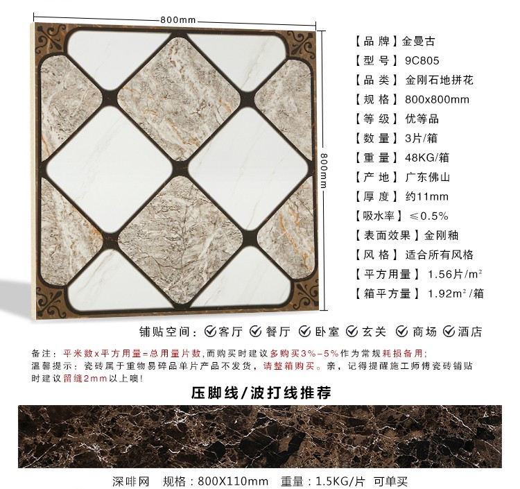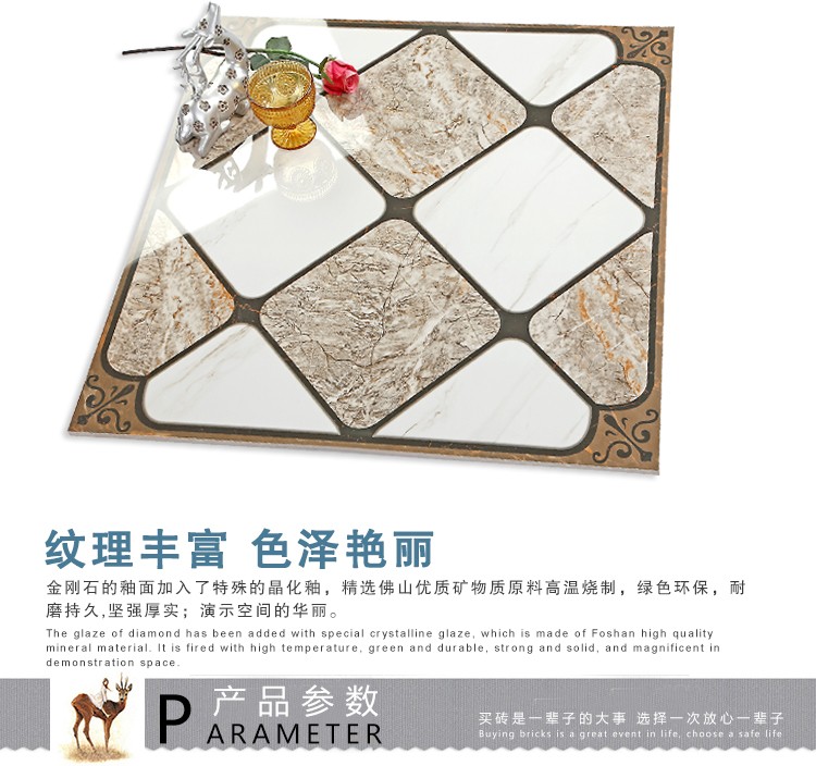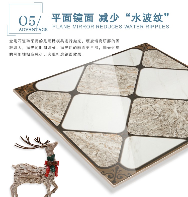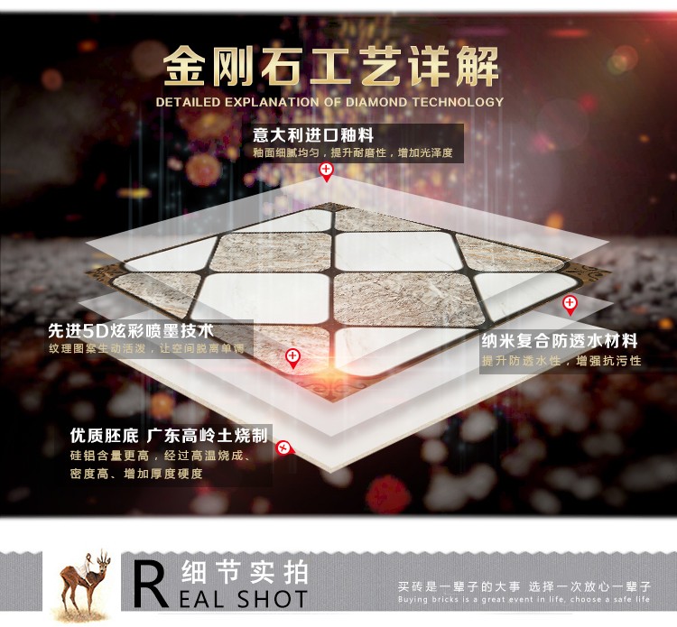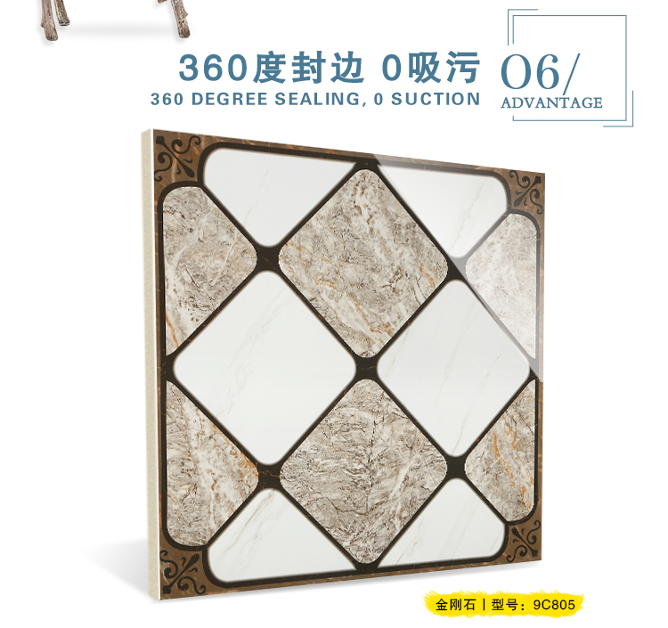 金曼古瓷磚廠家特價(jià)金剛石因高品質(zhì)而得名,是一款極具天然石材效果和微晶石質(zhì)感的仿石材瓷磚,它不但在價(jià)格、環(huán)保、耐用和清潔上極具優(yōu)勢,在質(zhì)感、規(guī)格、花色、重量等指標(biāo)上,金剛石都遠(yuǎn)遠(yuǎn)勝于石材、拋光磚。相比其他種類的產(chǎn)品,它最大的特點(diǎn)可以用“高亮度、高耐磨、高平整、高逼真、高清晰、高環(huán)保”。