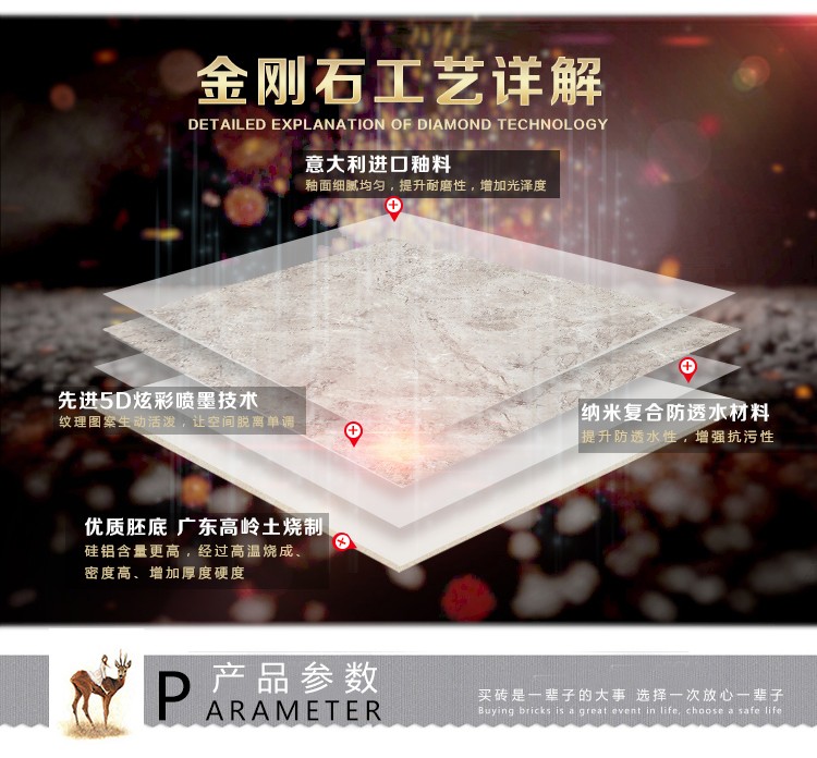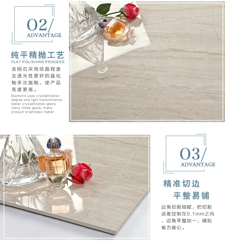 金曼古瓷磚廠家特價金剛石因高品質(zhì)而得名,是一款極具天然石材效果和微晶石質(zhì)感的仿石材瓷磚,它不但在價格、環(huán)保、耐用和清潔上極具優(yōu)勢,在質(zhì)感、規(guī)格、花色、重量等指標(biāo)上,金剛石都遠(yuǎn)遠(yuǎn)勝于石材、拋光磚。相比其他種類的產(chǎn)品,它最大的特點可以用“高亮度、高耐磨、高平整、高逼真、高清晰、高環(huán)保”。