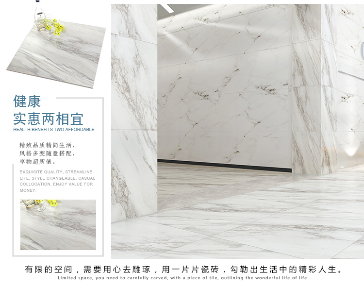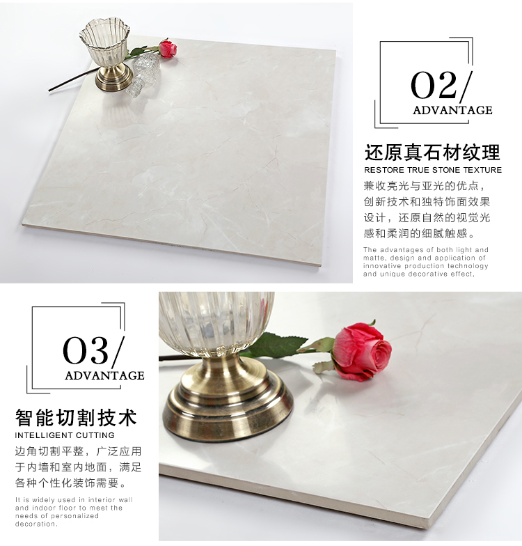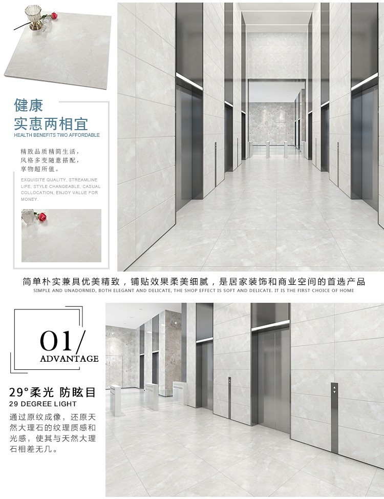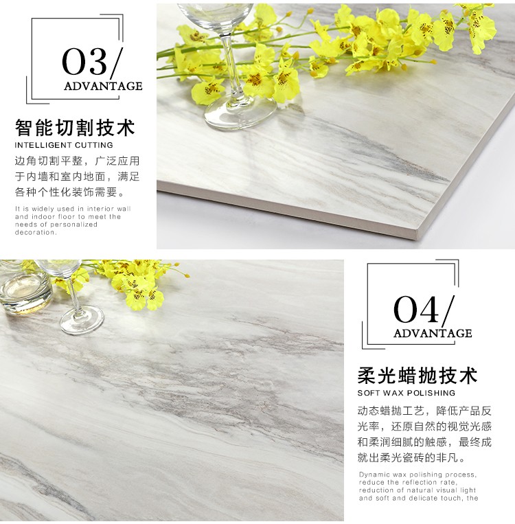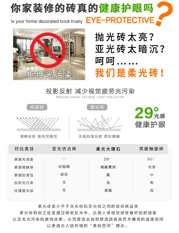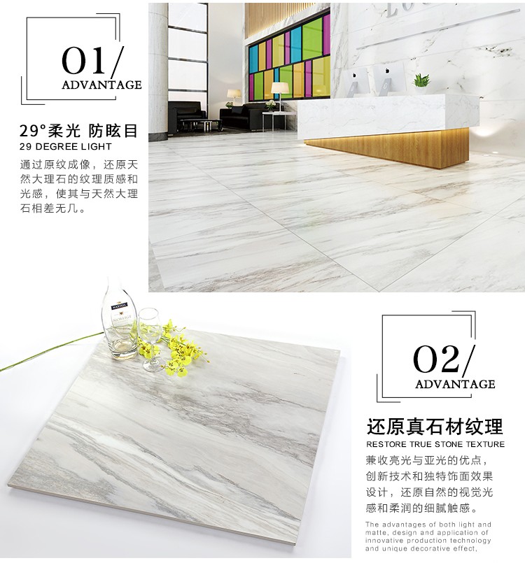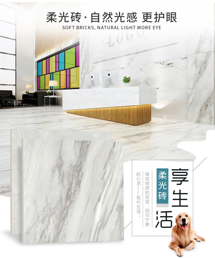柔光瓷磚是磚面反射介于強光與弱光之間的一類瓷磚,其結合亮光類瓷磚的高調明艷裝飾和啞光類瓷磚的低調內斂搭配效果,通過動態柔光蠟拋技術,降低產品反光率,從而達到人體舒適的視覺感受以及無光污染的空間裝飾效果。優點:1.視覺舒適,無光污染 2.堅固耐磨,不易刮花.