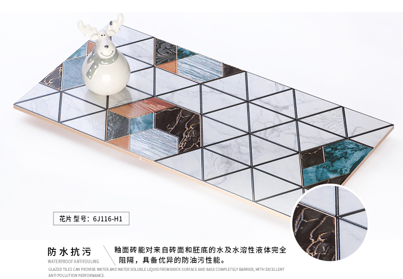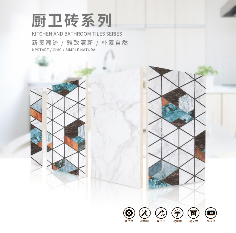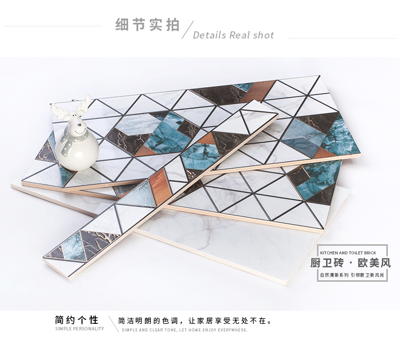 適用于洗手間、廚房、室外陽臺的立面裝飾,是保護墻面免遭水濺的有效途徑。它們不僅用于墻面,用在門窗的邊緣裝飾上,也是一種有趣的裝飾元素。用于踢腳線處的裝飾墻磚,既美觀又保護墻基不易被鞋或桌椅凳腳弄臟。