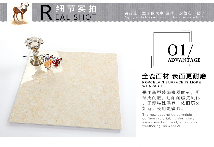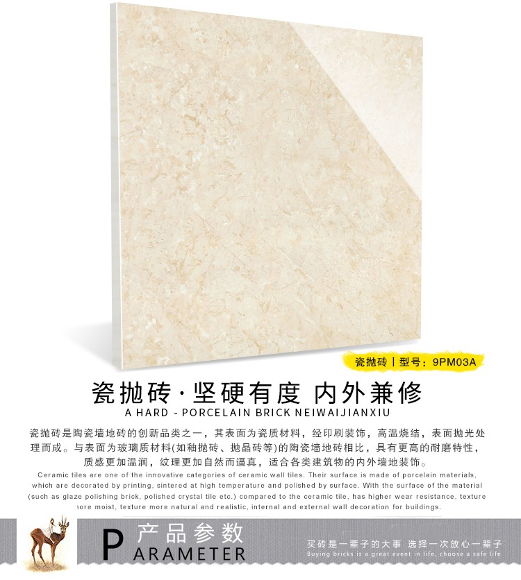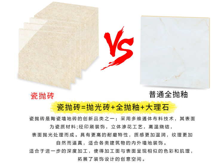 瓷拋磚,是陶瓷墻地磚的創新品類之一,其表面為瓷質材料,經印刷裝飾,高溫燒結,表面拋光處理而成。與表面為玻璃質材料的陶瓷墻地磚相比,具有更高的耐磨特性,質感更加溫潤,紋理更加自然而逼真,適合各類建筑物的內外墻地裝飾。
